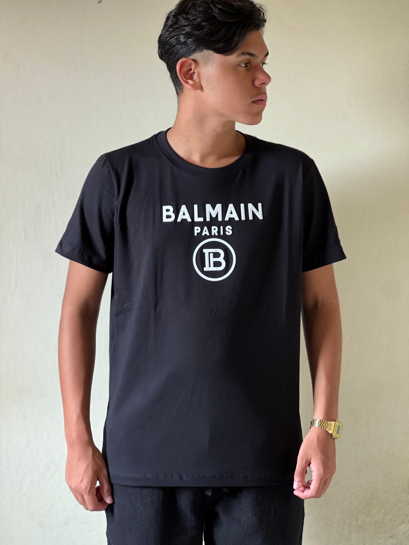 Camiseta Balmain preta malha peruana