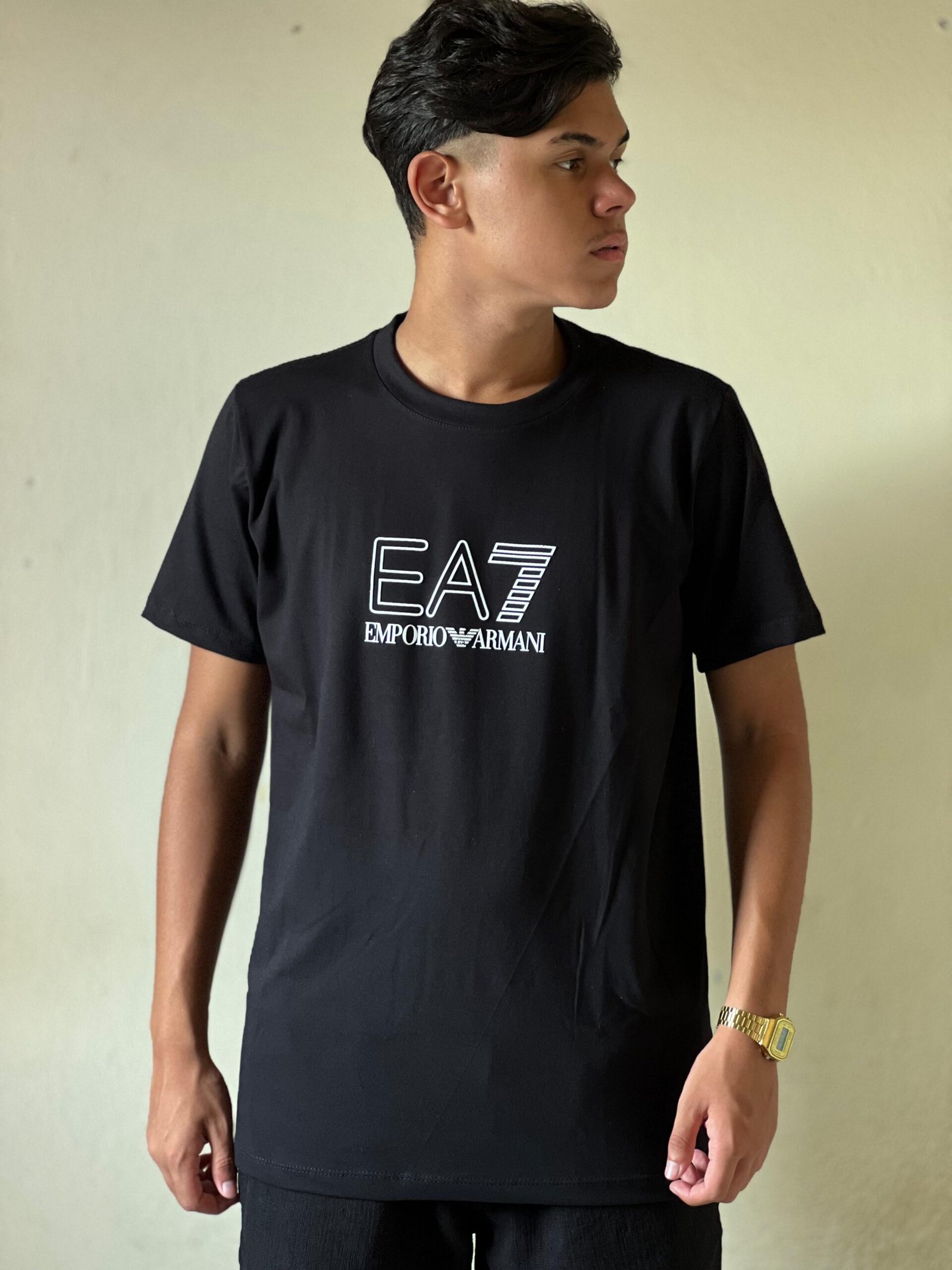 A camiseta preta da Emporio Armani, feita em malha peruana, é a escolha ideal para quem valoriza conforto e elegância em uma peça única. Com um toque macio e um caimento impecável, ela combina um design minimalista com a sofisticação discreta da marca. Versátil e moderna, é perfeita para composições casuais ou refinadas, trazendo exclusividade e estilo ao seu guarda-roupa.